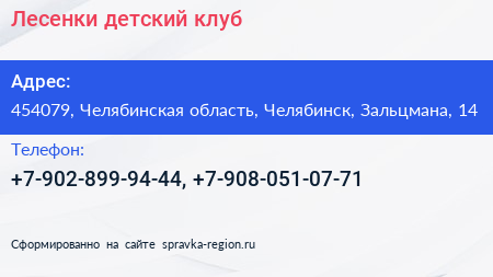 Лесенки, детский клуб по адресу 454079, Челябинская область, Челябинск, Зальцмана, 14 в дальнейшем Организация, размещена в следующих категориях: