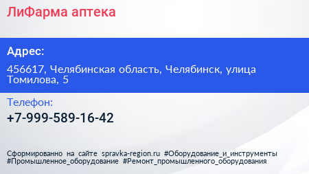 ЛиФарма, аптека по адресу 456617, Челябинская область, Челябинск, улица Томилова, 5 в дальнейшем Организация, размещена в следующих категориях: