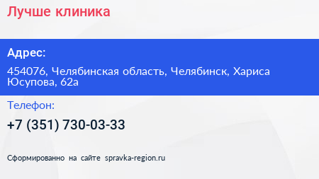 Лучше, клиника по адресу 454076, Челябинская область, Челябинск, Хариса Юсупова, 62а в дальнейшем Организация, размещена в следующих категориях:
