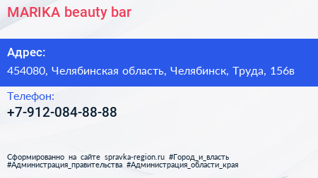 MARIKA beauty bar по адресу 454080, Челябинская область, Челябинск, Труда, 156в в дальнейшем Организация, размещена в следующих категориях: