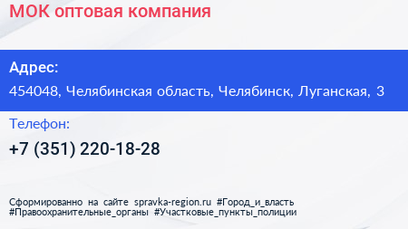 МОК, оптовая компания по адресу 454048, Челябинская область, Челябинск, Луганская, 3 в дальнейшем Организация, размещена в следующих категориях: