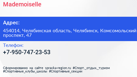 Mademoiselle по адресу 454014, Челябинская область, Челябинск, Комсомольский проспект, 47 в дальнейшем Организация, размещена в следующих категориях: