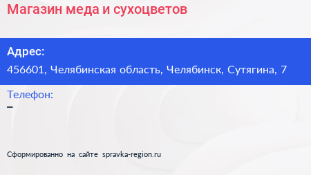 Магазин меда и сухоцветов по адресу 456601, Челябинская область, Челябинск, Сутягина, 7 в дальнейшем Организация, размещена в следующих категориях: