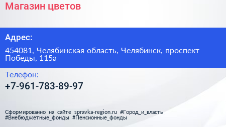 Магазин цветов по адресу 454081, Челябинская область, Челябинск, проспект Победы, 115а в дальнейшем Организация, размещена в следующих категориях:
