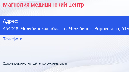 Магнолия, медицинский центр по адресу 454048, Челябинская область, Челябинск, Воровского, 61Б в дальнейшем Организация, размещена в следующих категориях: