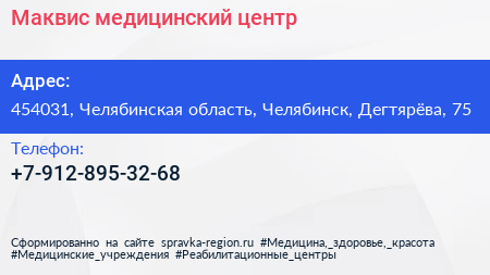 Маквис, медицинский центр по адресу 454031, Челябинская область, Челябинск, Дегтярёва, 75 в дальнейшем Организация, размещена в следующих категориях: