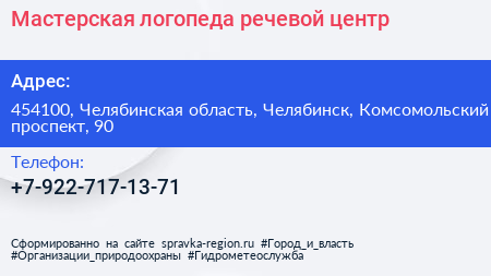 Мастерская логопеда, речевой центр по адресу 454100, Челябинская область, Челябинск, Комсомольский проспект, 90 в дальнейшем Организация, размещена в следующих категориях:
