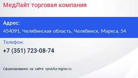 МедЛайт, торговая компания по адресу 454091, Челябинская область, Челябинск, Маркса, 54 в дальнейшем Организация, размещена в следующих категориях: