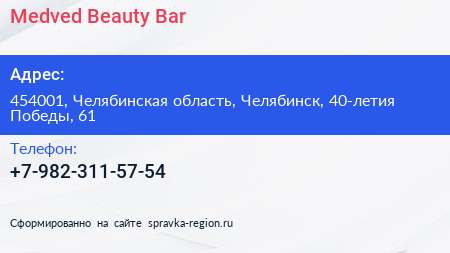 Medved Beauty Bar по адресу 454001, Челябинская область, Челябинск, 40-летия Победы, 61 в дальнейшем Организация, размещена в следующих категориях: