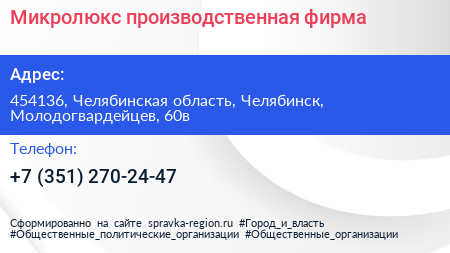 Микролюкс, производственная фирма по адресу 454136, Челябинская область, Челябинск, Молодогвардейцев, 60в в дальнейшем Организация, размещена в следующих категориях: