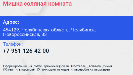 Мишка, соляная комната по адресу 454129, Челябинская область, Челябинск, Новороссийская, 83 в дальнейшем Организация, размещена в следующих категориях: