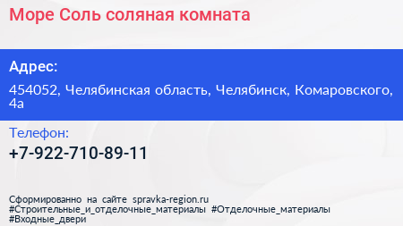 Море & Соль, соляная комната по адресу 454052, Челябинская область, Челябинск, Комаровского, 4а в дальнейшем Организация, размещена в следующих категориях: