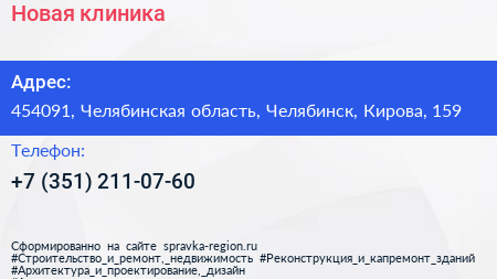 Новая клиника по адресу 454091, Челябинская область, Челябинск, Кирова, 159 в дальнейшем Организация, размещена в следующих категориях:
