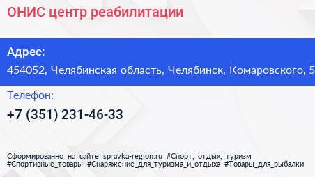 ОНИС, центр реабилитации по адресу 454052, Челябинская область, Челябинск, Комаровского, 5 в дальнейшем Организация, размещена в следующих категориях: