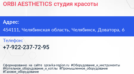 ORBI AESTHETICS, студия красоты по адресу 454111, Челябинская область, Челябинск, Доватора, 6 в дальнейшем Организация, размещена в следующих категориях:
