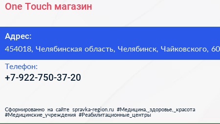 One Touch, магазин по адресу 454018, Челябинская область, Челябинск, Чайковского, 60 в дальнейшем Организация, размещена в следующих категориях: