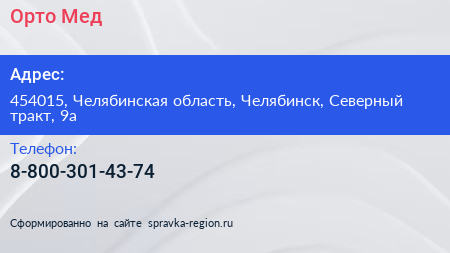 Орто-Мед по адресу 454015, Челябинская область, Челябинск, Северный тракт, 9а в дальнейшем Организация, размещена в следующих категориях: