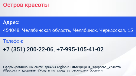Остров красоты по адресу 454048, Челябинская область, Челябинск, Черкасская, 15 в дальнейшем Организация, размещена в следующих категориях: