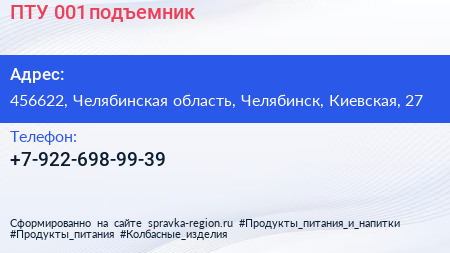 ПТУ-001, подъемник по адресу 456622, Челябинская область, Челябинск, Киевская, 27 в дальнейшем Организация, размещена в следующих категориях: