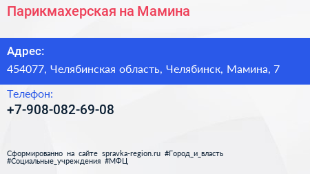 Парикмахерская на Мамина по адресу 454077, Челябинская область, Челябинск, Мамина, 7 в дальнейшем Организация, размещена в следующих категориях: