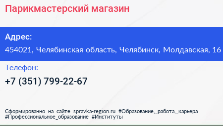 Парикмастерский магазин по адресу 454021, Челябинская область, Челябинск, Молдавская, 16 в дальнейшем Организация, размещена в следующих категориях: