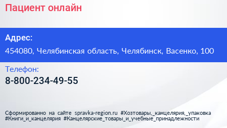 Пациент.онлайн по адресу 454080, Челябинская область, Челябинск, Васенко, 100 в дальнейшем Организация, размещена в следующих категориях: