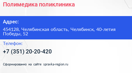 Полимедика, поликлиника по адресу 454128, Челябинская область, Челябинск, 40-летия Победы, 52 в дальнейшем Организация, размещена в следующих категориях:
