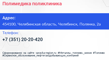 Полимедика, поликлиника по адресу 454100, Челябинская область, Челябинск, Полянка, 2а в дальнейшем Организация, размещена в следующих категориях: