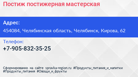 Постиж, постижерная мастерская по адресу 454084, Челябинская область, Челябинск, Кирова, 62 в дальнейшем Организация, размещена в следующих категориях: