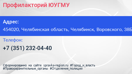 Профилакторий, ЮУГМУ по адресу 454020, Челябинская область, Челябинск, Воровского, 38Б в дальнейшем Организация, размещена в следующих категориях:
