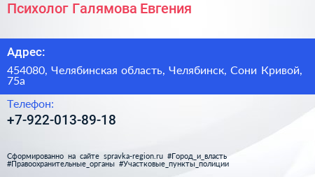 Психолог Галямова Евгения по адресу 454080, Челябинская область, Челябинск, Сони Кривой, 75а в дальнейшем Организация, размещена в следующих категориях: