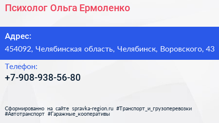 Психолог Ольга Ермоленко по адресу 454092, Челябинская область, Челябинск, Воровского, 43 в дальнейшем Организация, размещена в следующих категориях: