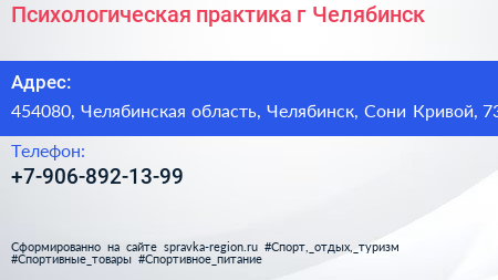 Психологическая практика, г. Челябинск по адресу 454080, Челябинская область, Челябинск, Сони Кривой, 73 в дальнейшем Организация, размещена в следующих категориях: