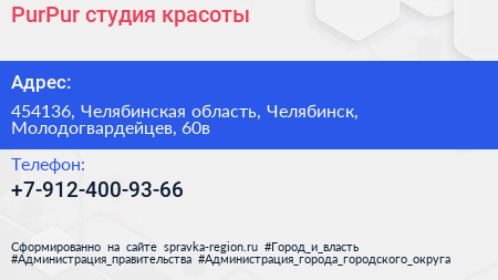 PurPur, студия красоты по адресу 454136, Челябинская область, Челябинск, Молодогвардейцев, 60в в дальнейшем Организация, размещена в следующих категориях: