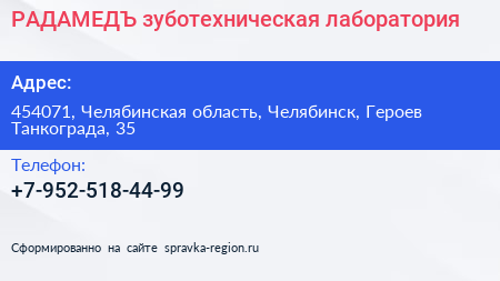 РАДАМЕДЪ, зуботехническая лаборатория по адресу 454071, Челябинская область, Челябинск, Героев Танкограда, 35 в дальнейшем Организация, размещена в следующих категориях: