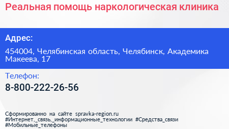 Реальная помощь, наркологическая клиника по адресу 454004, Челябинская область, Челябинск, Академика Макеева, 17 в дальнейшем Организация, размещена в следующих категориях: