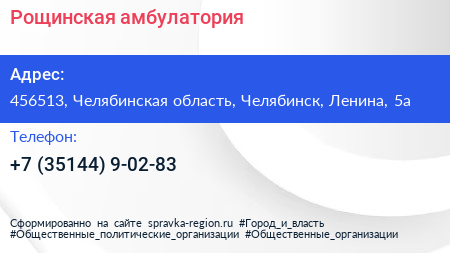 Рощинская амбулатория по адресу 456513, Челябинская область, Челябинск, Ленина, 5а в дальнейшем Организация, размещена в следующих категориях: