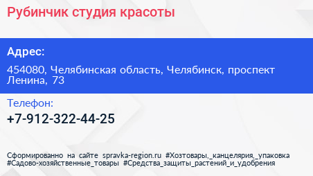Рубинчик, студия красоты по адресу 454080, Челябинская область, Челябинск, проспект Ленина, 73 в дальнейшем Организация, размещена в следующих категориях: