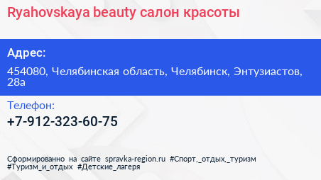 Ryahovskaya beauty, салон красоты по адресу 454080, Челябинская область, Челябинск, Энтузиастов, 28а в дальнейшем Организация, размещена в следующих категориях: