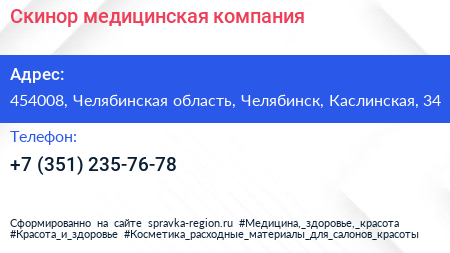 Скинор, медицинская компания по адресу 454008, Челябинская область, Челябинск, Каслинская, 34 в дальнейшем Организация, размещена в следующих категориях: