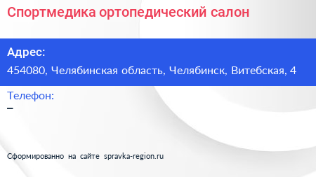 Спортмедика, ортопедический салон по адресу 454080, Челябинская область, Челябинск, Витебская, 4 в дальнейшем Организация, размещена в следующих категориях: