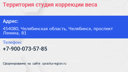 Территория, студия коррекции веса по адресу 454080, Челябинская область, Челябинск, проспект Ленина, 81 в дальнейшем Организация, размещена в следующих категориях: