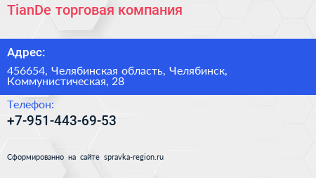 TianDe, торговая компания по адресу 456654, Челябинская область, Челябинск, Коммунистическая, 28 в дальнейшем Организация, размещена в следующих категориях: