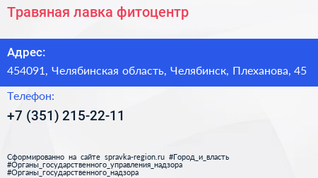 Травяная лавка, фитоцентр по адресу 454091, Челябинская область, Челябинск, Плеханова, 45 в дальнейшем Организация, размещена в следующих категориях: