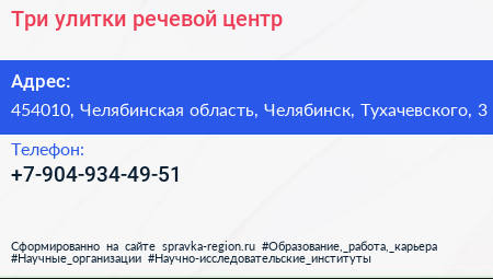 Три улитки, речевой центр по адресу 454010, Челябинская область, Челябинск, Тухачевского, 3 в дальнейшем Организация, размещена в следующих категориях: