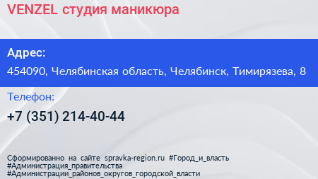 VENZEL, студия маникюра по адресу 454090, Челябинская область, Челябинск, Тимирязева, 8 в дальнейшем Организация, размещена в следующих категориях: