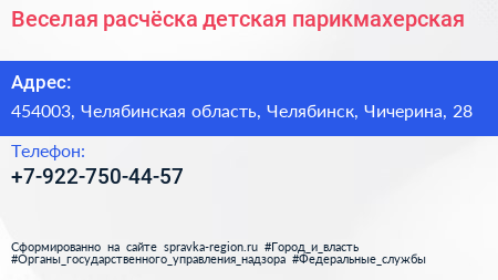 Веселая расчёска, детская парикмахерская по адресу 454003, Челябинская область, Челябинск, Чичерина, 28 в дальнейшем Организация, размещена в следующих категориях: