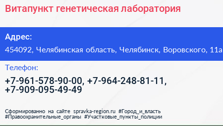 Витапункт, генетическая лаборатория по адресу 454092, Челябинская область, Челябинск, Воровского, 11а в дальнейшем Организация, размещена в следующих категориях: