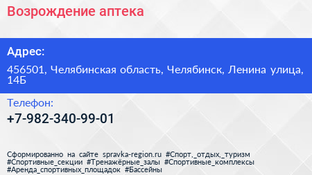 Возрождение, аптека по адресу 456501, Челябинская область, Челябинск, Ленина улица, 14Б в дальнейшем Организация, размещена в следующих категориях:
