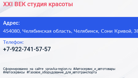 XXI ВЕК, студия красоты по адресу 454080, Челябинская область, Челябинск, Сони Кривой, 38 в дальнейшем Организация, размещена в следующих категориях: